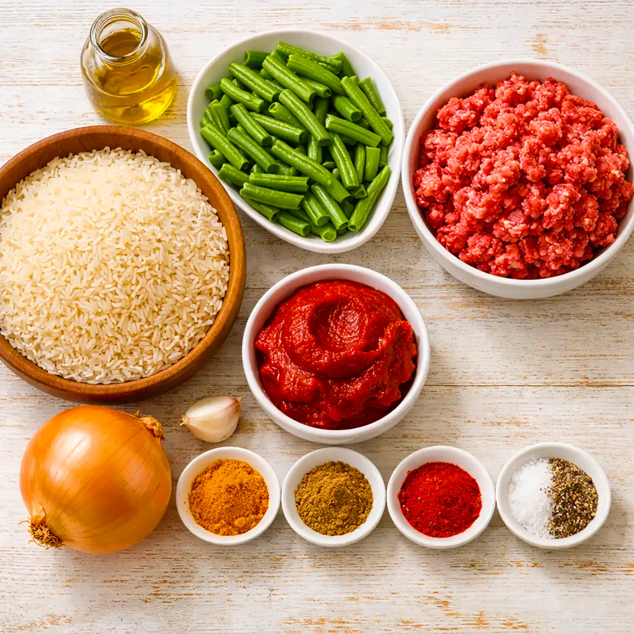 برنج را 2 تا 3 بار بشویید و با 1 قاشق غذاخوری نمک و آب، حداقل 1 ساعت بخیسانید. لوبیا سبز را به اندازه 2 تا 3 سانت خرد کنید. پیاز را ریز خرد کنید تا در مایه گوشتی خوش بافت شود.
